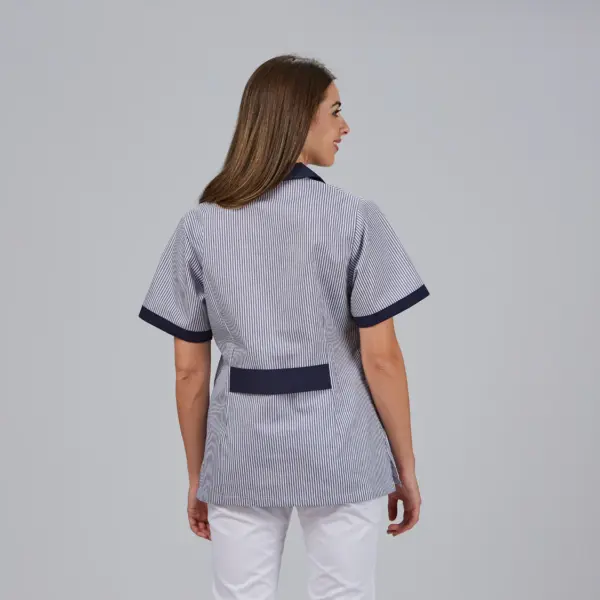 A nivel funcional, la bata mujer VICHY dispone de un bolsillo en el pecho izquierdo y dos bolsillos laterales, ofreciendo espacio práctico para herramientas o accesorios de trabajo. El cinturón trasero permite ajustar la prenda a medida, mejorando el ajuste y la comodidad.