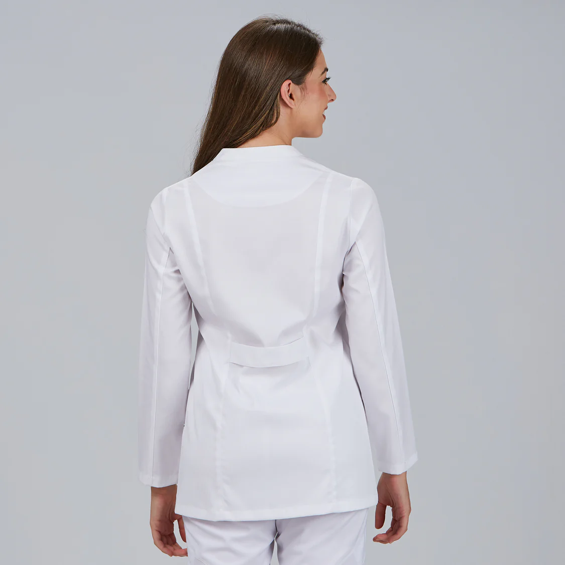 A nivel funcional, la bata MARILIA cuenta con cuatro bolsillos delanteros, incluyendo un bolsillo de ojal en el pecho izquierdo, ofreciendo espacio suficiente para el trabajo diario sin recargar el diseño.