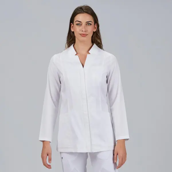 El diseño incluye un cuello con efecto solapa invertida, que aporta un toque moderno y diferente, junto con un cierre central con cremallera oculta, que refuerza la estética limpia y profesional de la prenda. La manga larga completa un conjunto pensado para una imagen más cuidada.