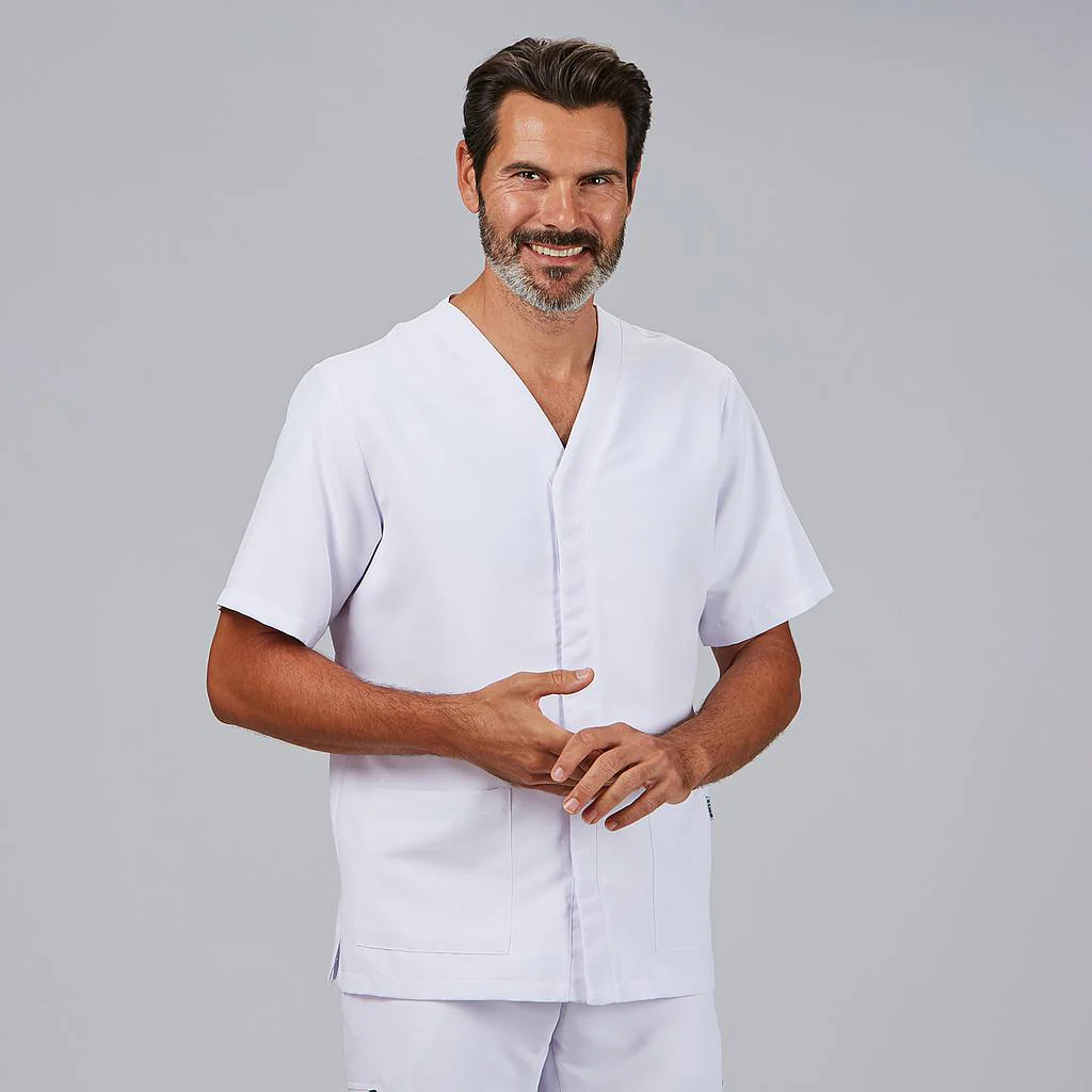 La blusa sanitaria Pablo para hombre es una prenda diseñada para ofrecer máxima funcionalidad, comodidad e higiene en entornos profesionales exigentes como sanidad e industria alimentaria. Su diseño con manga corta y cuello pico proporciona frescura y libertad de movimiento durante toda la jornada laboral.