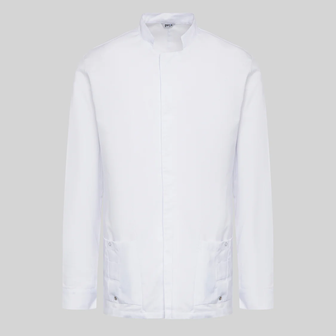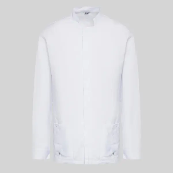 El diseño incorpora un elegante cuello mao y manga larga, aportando una estética profesional y cuidada. El cierre con botones de presión ocultos garantiza un acabado limpio y facilita el uso diario.