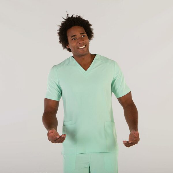 - Casaca hombre con cuello de pico y tres bolsillos delanteros