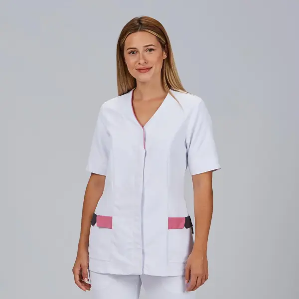 Su diseño incluye cuello en pico y manga corta, proporcionando comodidad y una imagen profesional. El cierre con botones de presión ocultos ofrece una estética limpia y facilita su colocación.