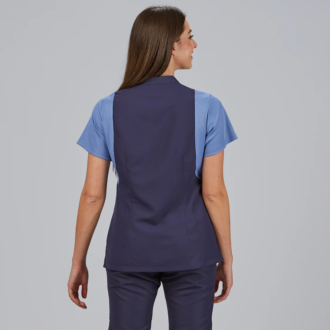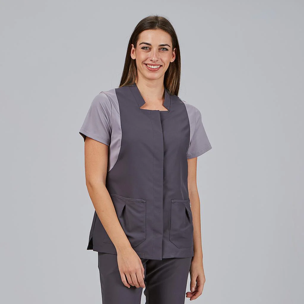 El diseño incorpora un escote cuadrado con cuello mao, aportando un estilo moderno y diferenciador. El cierre central con botones de presión ocultos mantiene una estética limpia y funcional, ideal para un entorno profesional.