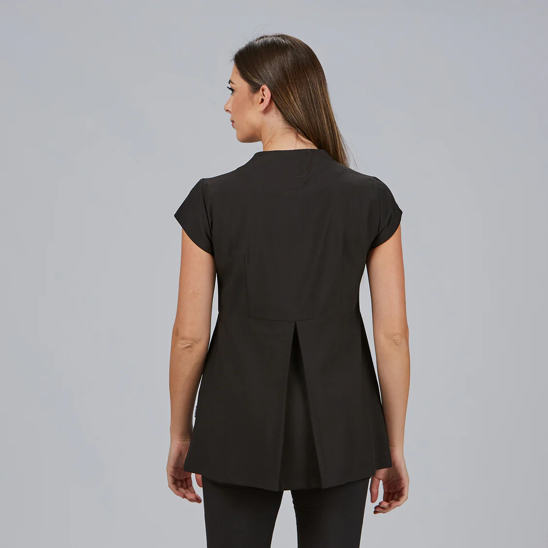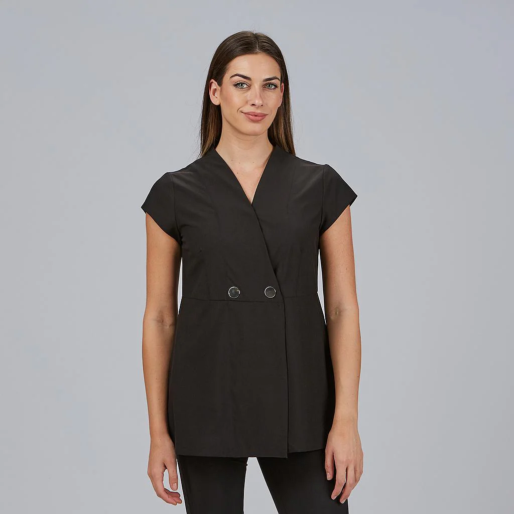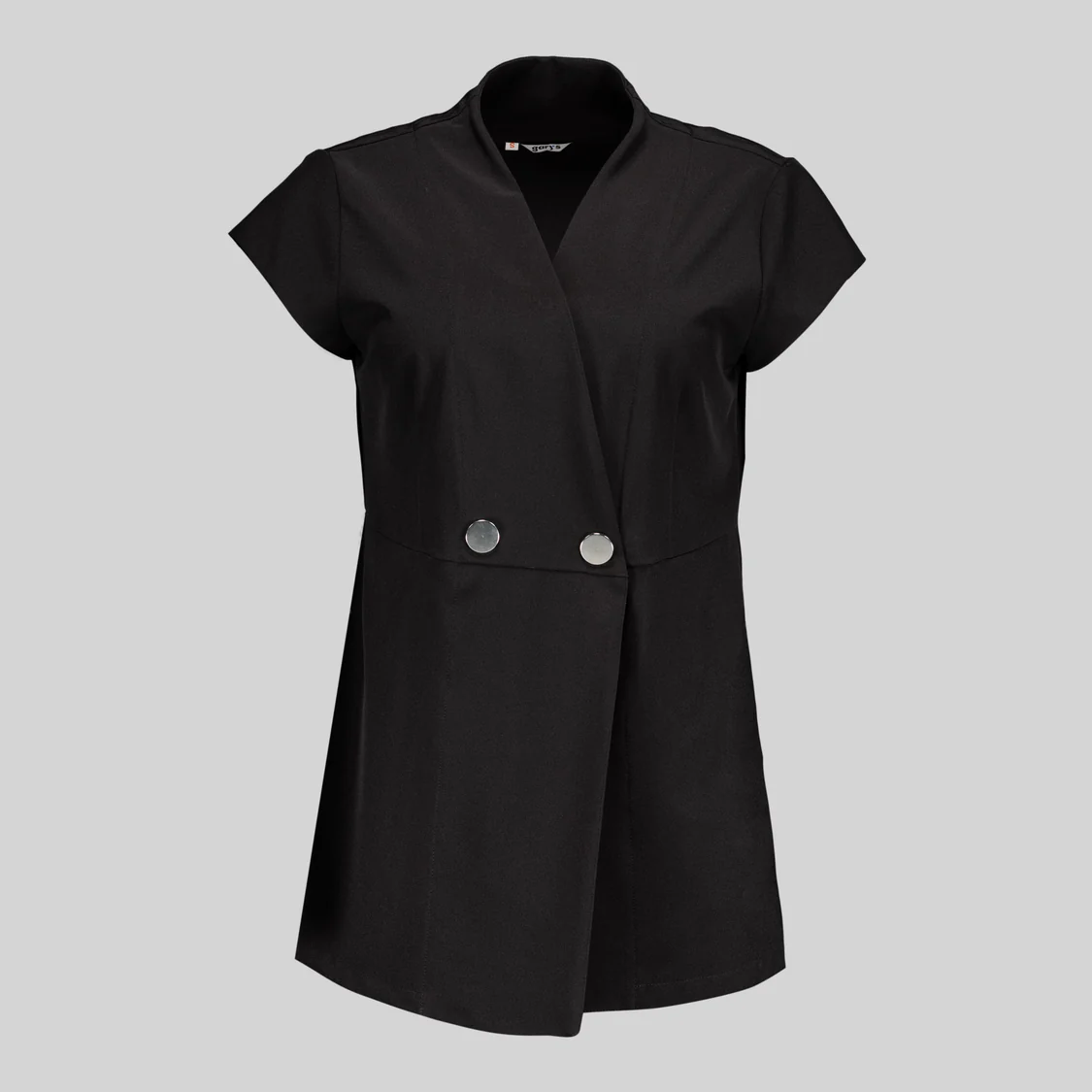 El diseño incorpora manga corta, favoreciendo la frescura, y un cierre con botones de presión, que permite poner y quitar la prenda de forma rápida y cómoda, ideal en entornos donde se trabaja por turnos o con clientes continuos.