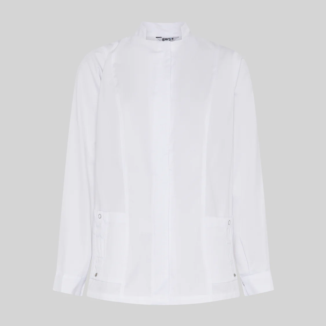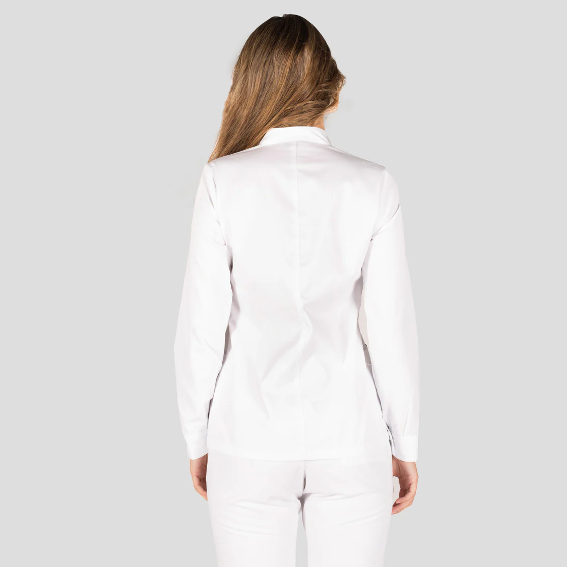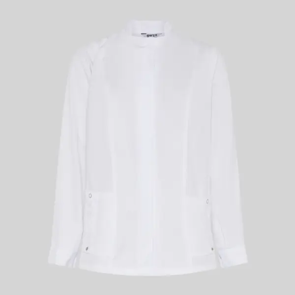 El diseño incorpora un elegante cuello mao y manga larga, aportando una estética moderna y profesional. El cierre central con botones de presión ocultos garantiza un acabado limpio y facilita el uso diario.