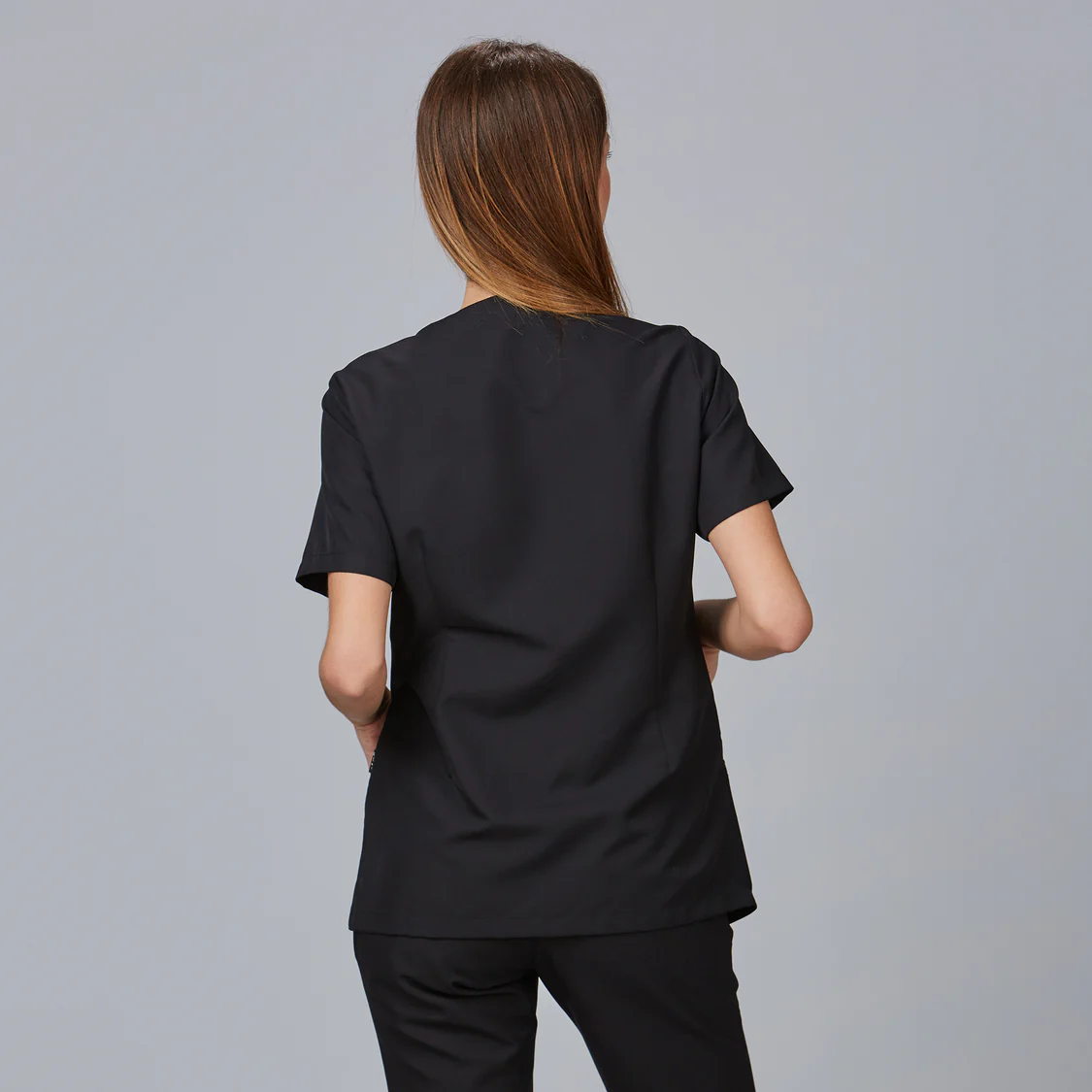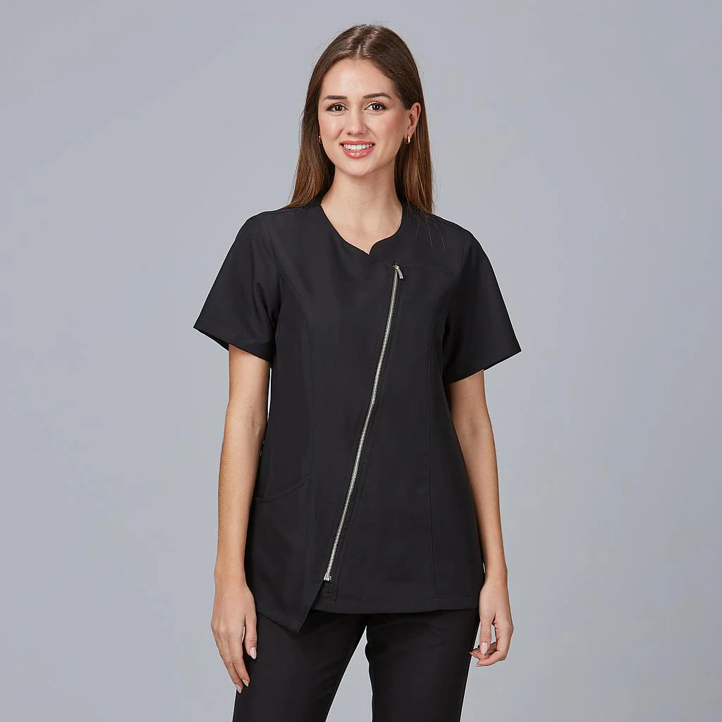 Su diseño incorpora manga corta y cierre diagonal con cremallera metálica, aportando un aspecto moderno y facilitando el uso diario. El bajo asimétrico añade un toque actual al uniforme y mejora la comodidad en movimiento.