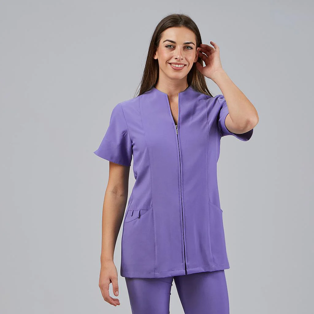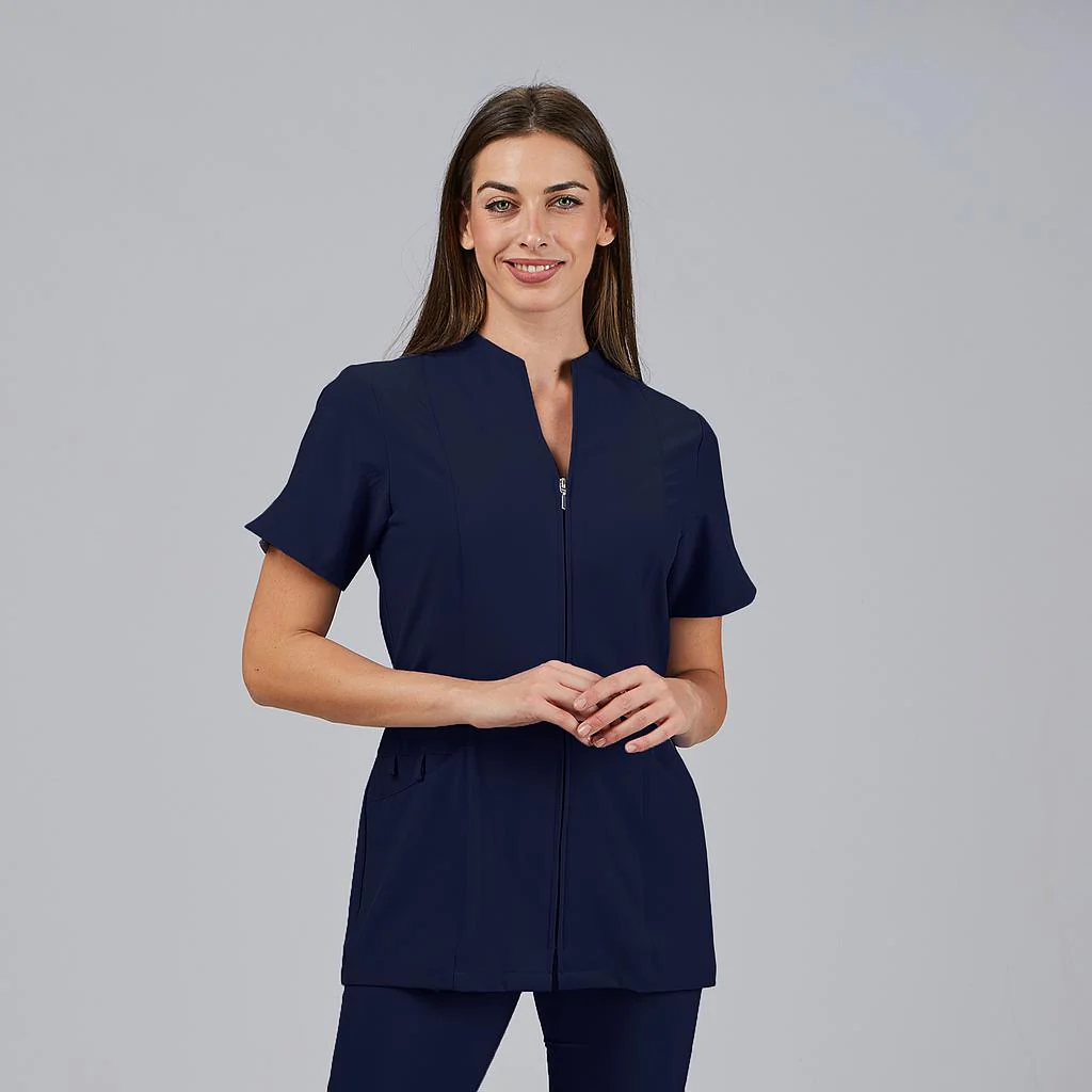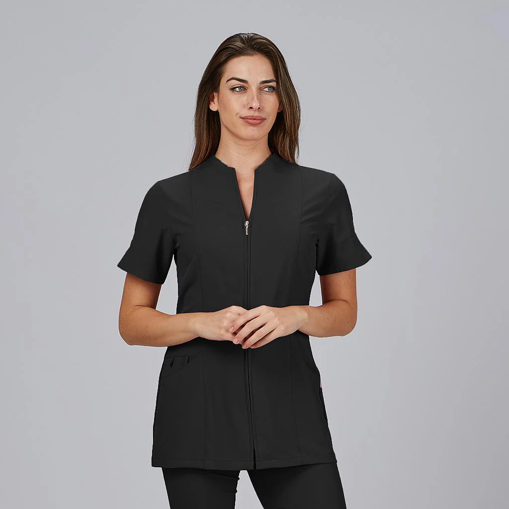 Blusa sanitaria mujer YANIRA en microfibra elástica 360º, transpirable y con tratamiento antibacteriano SILVADUR. Con cremallera frontal y cuello chimenea, ideal para sanidad, estética o clínicas.