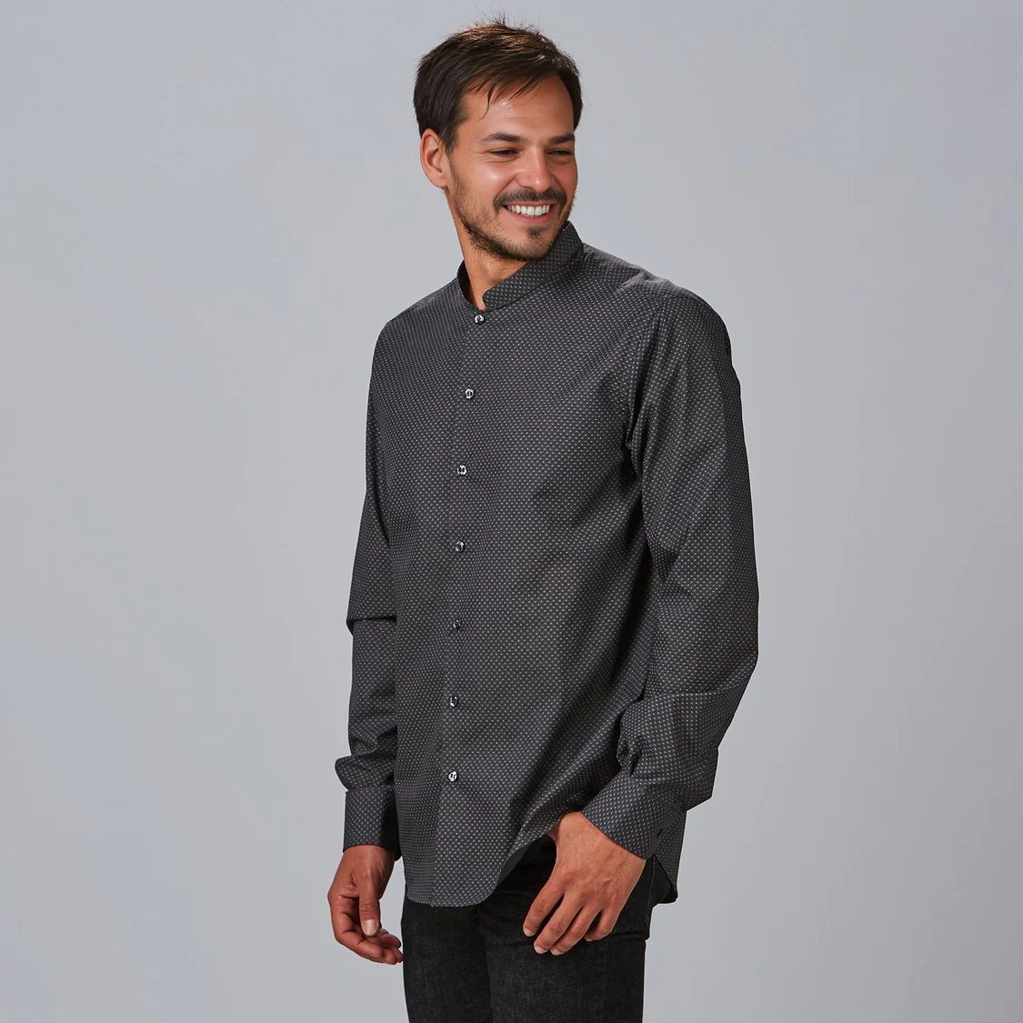 Su corte slim fit proporciona una silueta estilizada que realza la figura masculina, aportando un look moderno y elegante. El cuello mao añade un toque distintivo y actual, ideal para negocios que buscan una imagen más innovadora.