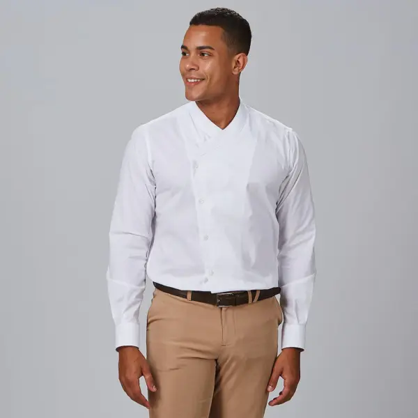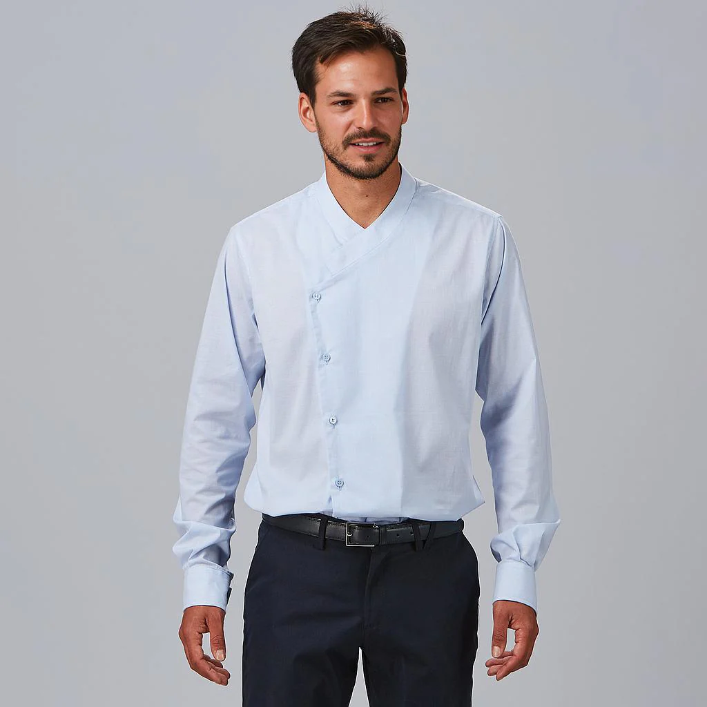 Si buscas renovar la imagen del uniforme de cocina con un modelo más moderno y estilizado, esta camisa es una gran opción. El cuello mao, el corte slim fit y el cierre cruzado aportan una presencia más profesional y actual, muy útil en cocinas abiertas o negocios donde el cliente ve al equipo.