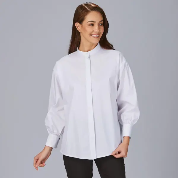 El diseño incorpora un cuello mao con abertura, que aporta un toque elegante y actual, junto con manga larga abullonada con apertura y botón en el puño, creando un estilo distintivo y sofisticado.