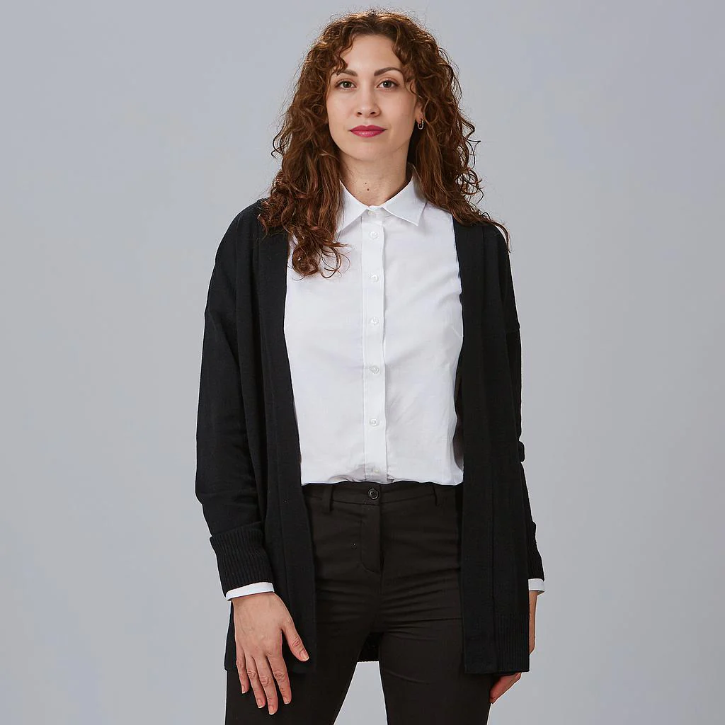 El cardigan sin botones es una prenda pensada para profesionales que buscan comodidad, rapidez y una imagen cuidada en su jornada laboral. Su diseño práctico y actual la convierte en una opción muy útil para quienes necesitan una prenda fácil de poner, cómoda de llevar y adaptable a distintos entornos de trabajo.