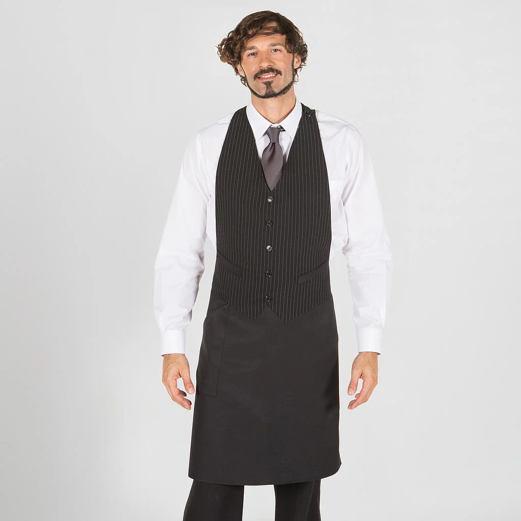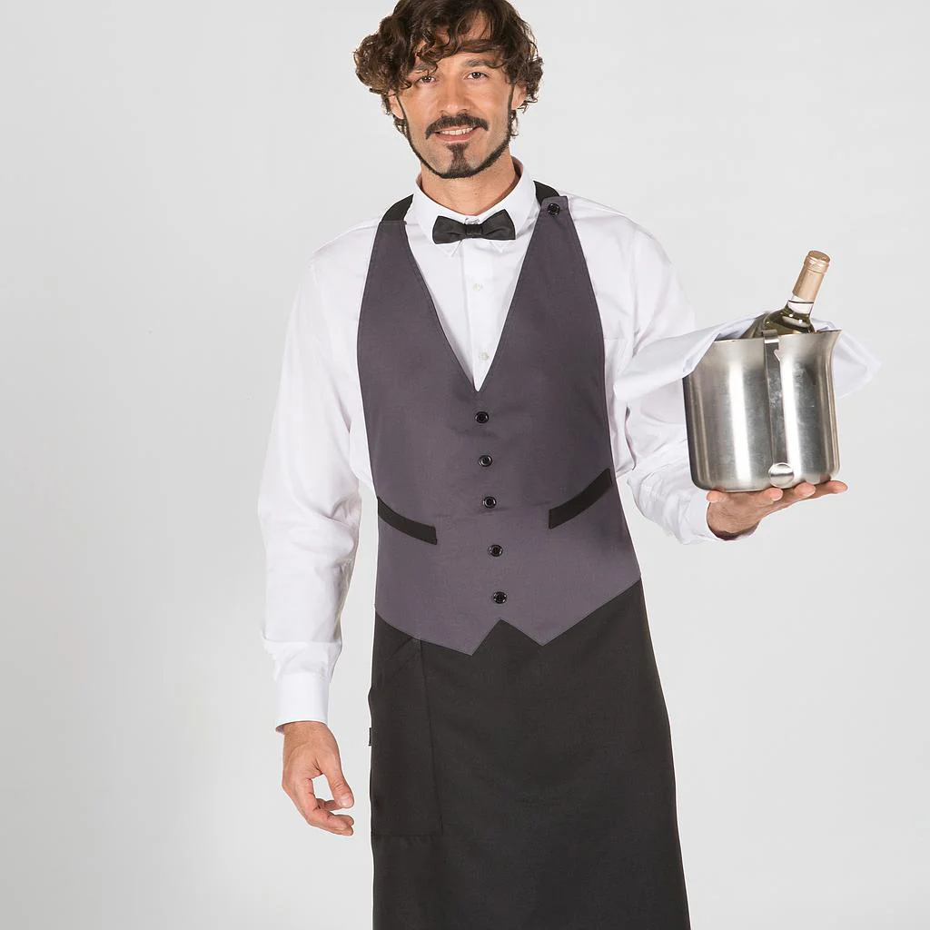 Su diseño innovador tipo chaleco aporta una imagen sofisticada y profesional, ideal para negocios de hostelería y comercio que quieren destacar con un uniforme diferente.