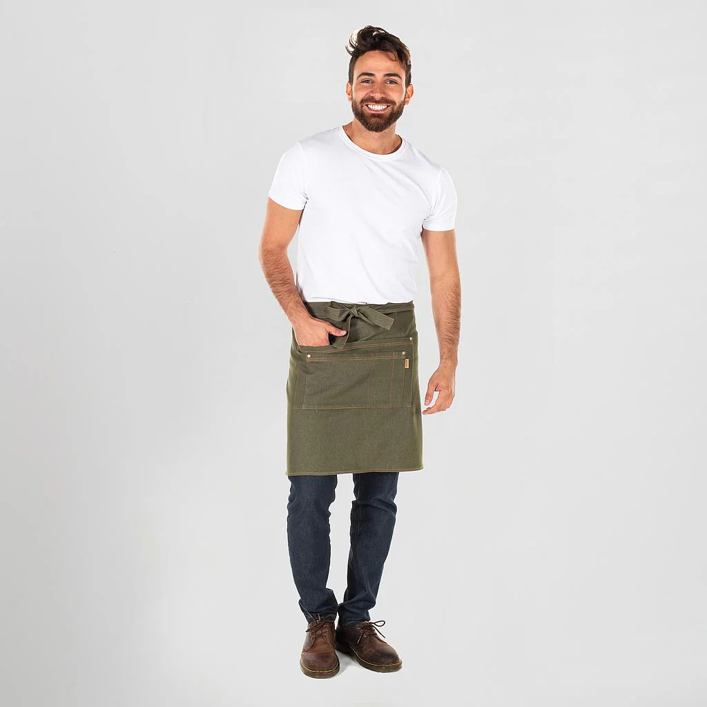 Confeccionado en tejido vaquero elástico de alta calidad, este delantal destaca por su resistencia, durabilidad y flexibilidad, adaptándose perfectamente a los movimientos durante largas jornadas de trabajo.