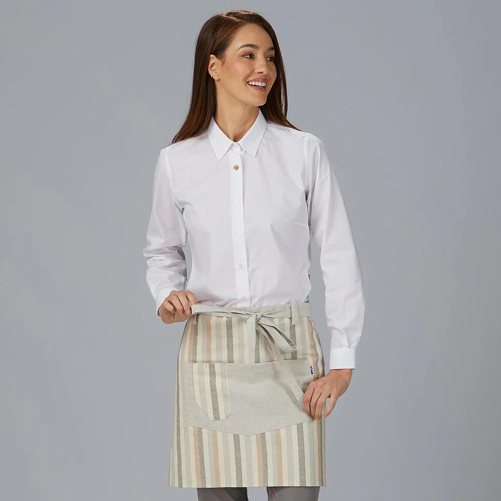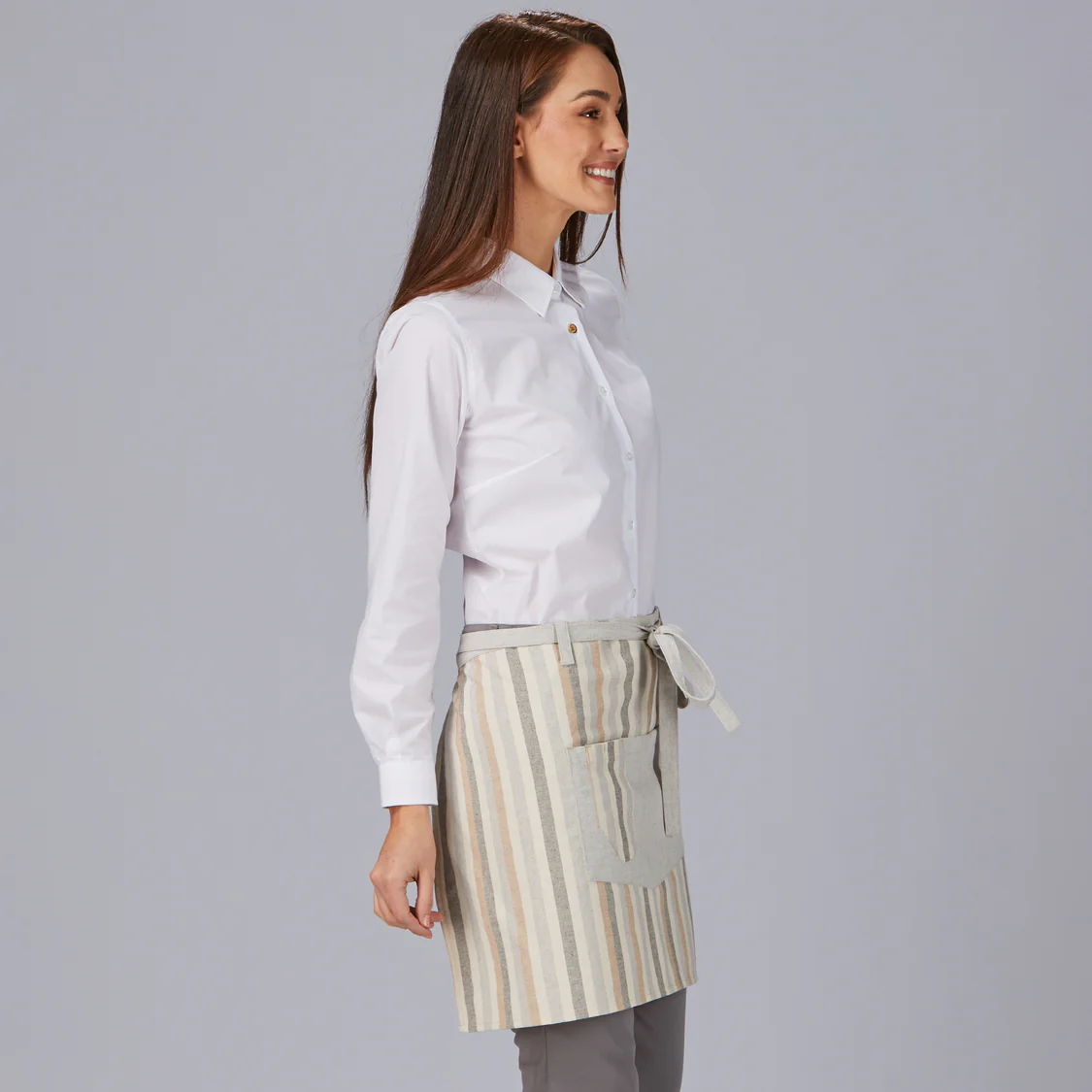 Su elegante diseño con estampado de rayas en tono gris claro aporta una imagen sofisticada, moderna y profesional, perfecta para destacar en entornos de hostelería, restauración y comercio.