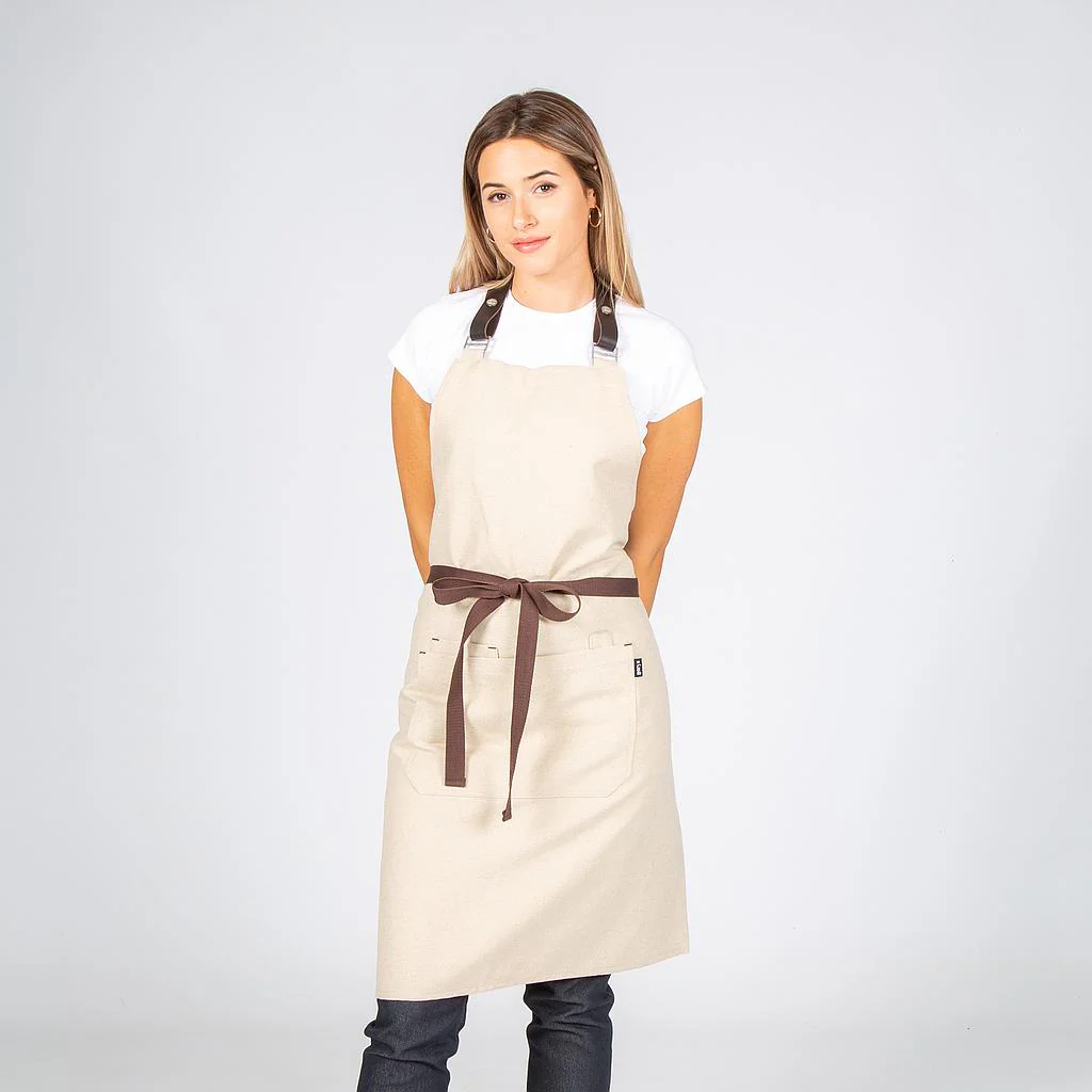 El delantal con peto beige con tirante de cuero es una prenda diseñada para profesionales que buscan elegancia, durabilidad y funcionalidad en su uniforme laboral.