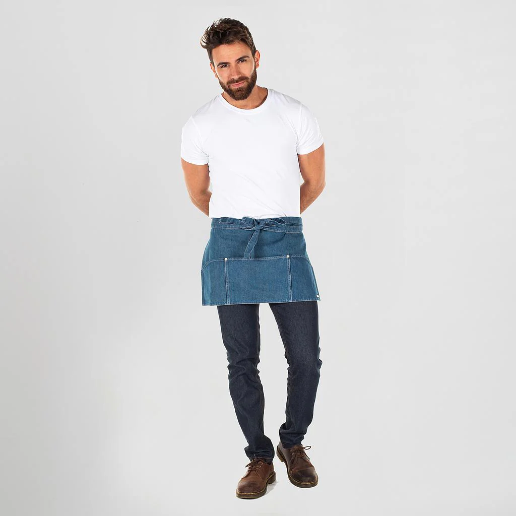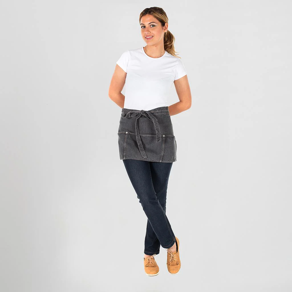 Su diseño a rayas en gris claro aporta una imagen elegante y actual, ideal para negocios de hostelería, restauración y comercio que quieren destacar con un uniforme cuidado.
