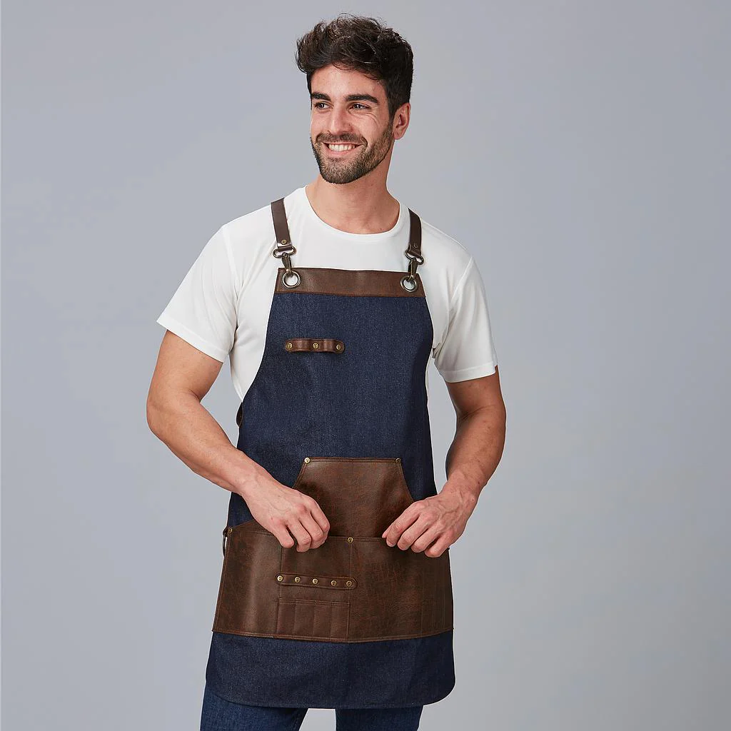 El delantal peto vaquero y piel ofrece resistencia, estilo premium y máxima funcionalidad profesional.