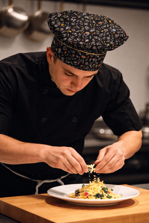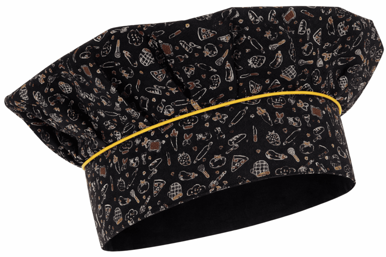 Gorro de chef MEGANO Valento es un gorro profesional tipo francés con estampado de cocina, diseñado para ofrecer comodidad, ajuste y resistencia, ideal para profesionales de hostelería, restauración.