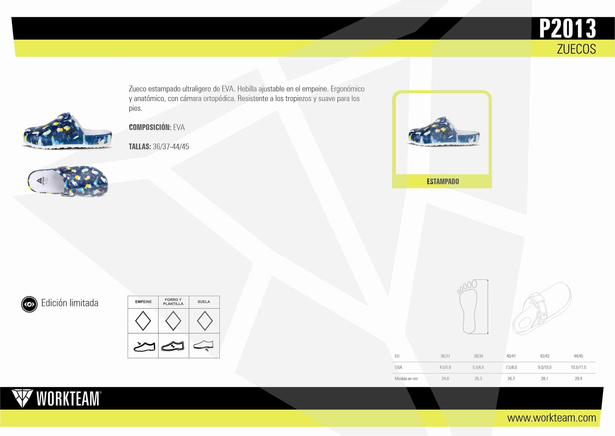 Zueco EVA estampado P2013 Workteam está diseñado para ofrecer máxima ligereza, comodidad y seguridad, siendo ideal para profesionales que pasan largas horas de pie y necesitan un calzado práctico y confortable.