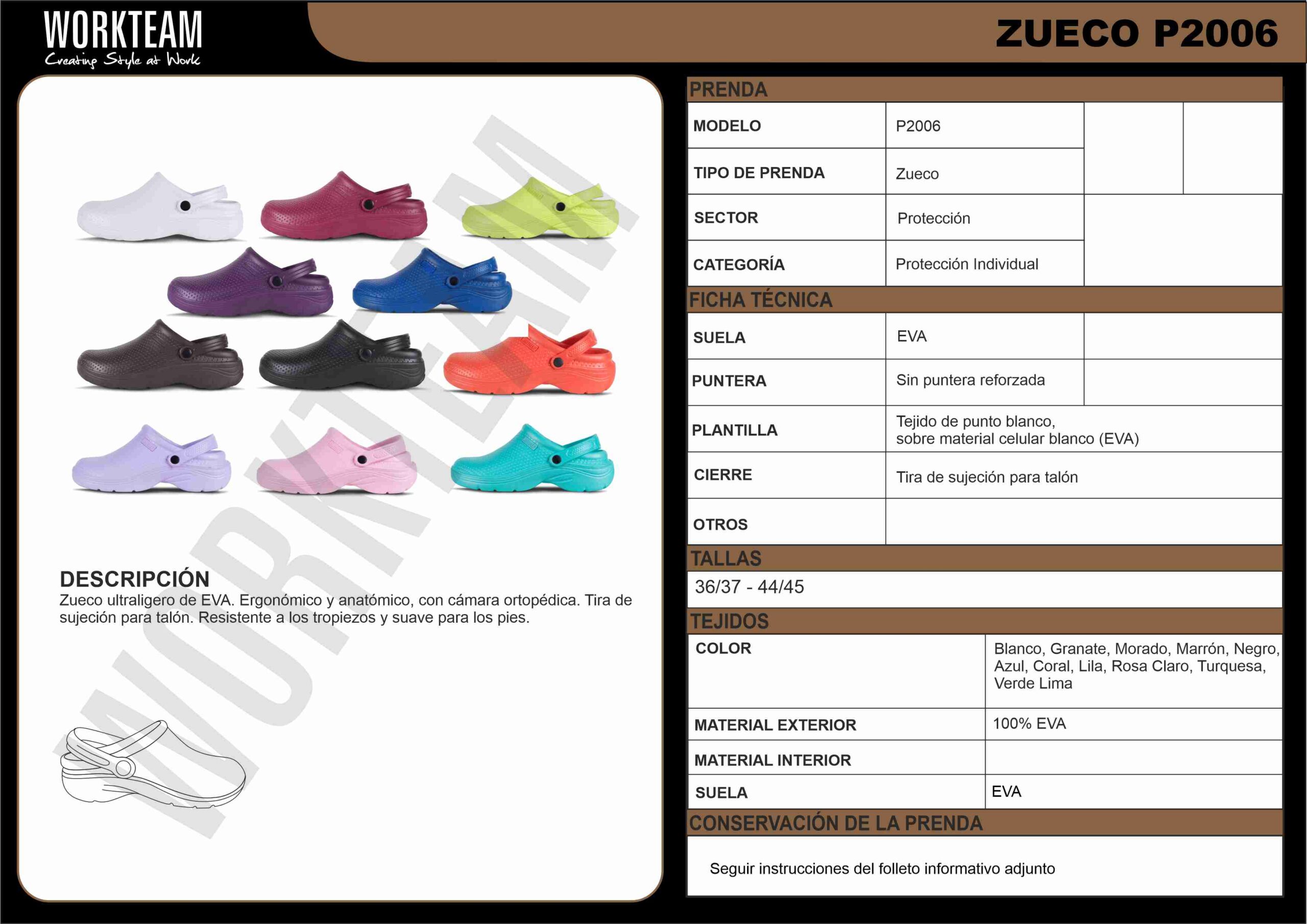 Zueco EVA unisex P2006 Workteam es un calzado profesional diseñado para ofrecer máxima ligereza, comodidad y ergonomía, ideal para largas jornadas laborales donde se requiere confort y facilidad de movimiento.